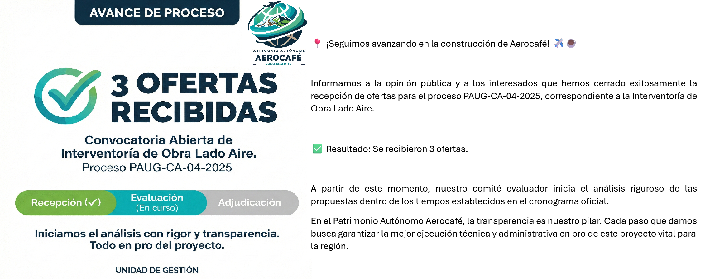 Bogotá, 30 de diciembre de 2025 APERTURA DE CONVOCATORIA ABIERTA PARA LA INTERVENTORÍA DE OBRA – AEROPUERTO DEL CAFÉ El Patrimonio Autónomo Aerocafé, en cumplimiento de sus principios de transparencia, publicidad y selección objetiva, se permite...